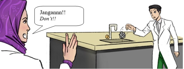 Semasa bekerja dengan bahan kimia di dalam makmal sekolah, salah seorang rakan anda terkena percikan acid pada matanya. Apakah langkah yang terbaik dan segera perlu anda lakukan? While doing work with chemical substances in the school laboratory, one of the friend’s eyes was split by acid. What is the best and fastest step that need to do? A Membilas mata rakan dengan air Rinse your friend eyes with water B Tunggu guru atau pembantu makmal datang Wait for teacher and laboratory assistant to come C Segera dibawa ke klinik Send your friend to clinic immediately D Lakukan eksperimen di dalam kebuk wasap Do the experiment in the fume chamber |